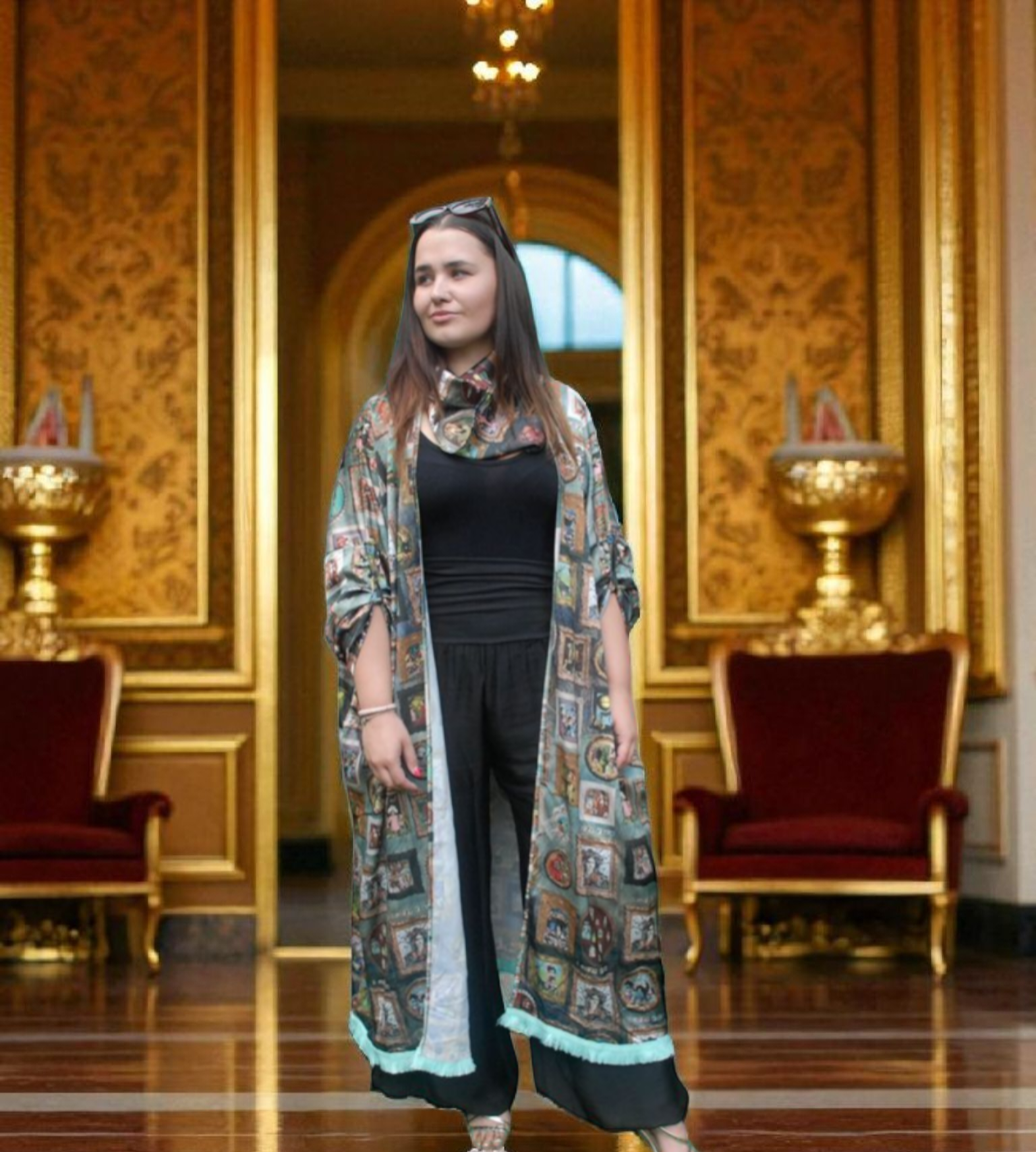 Add a touch of artistic flair to your wardrobe with this stunning blue-green 'I Love Frida' kimono.