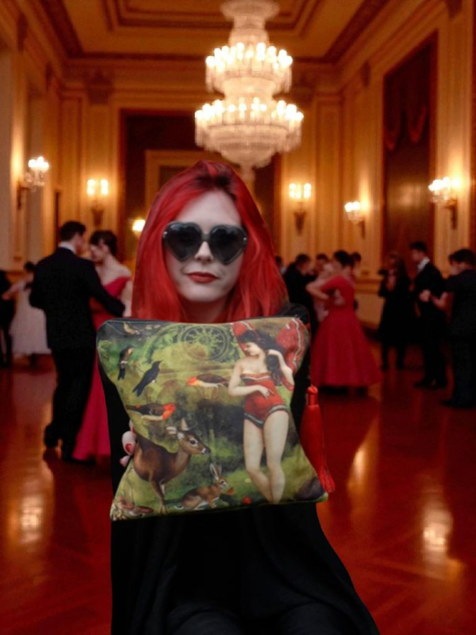 'Vintage Buttefly Girl' Velvet Clutch Bag with Red Satin Tassel